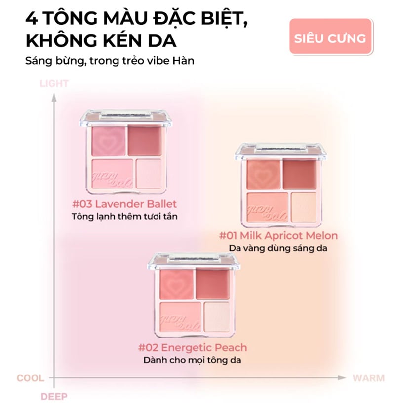 – Có các bảng màu phù hợp với nhiều phong cách từ trang điểm nhẹ nhàng hàng ngày đến phong cách cá tính, nổi bật như: