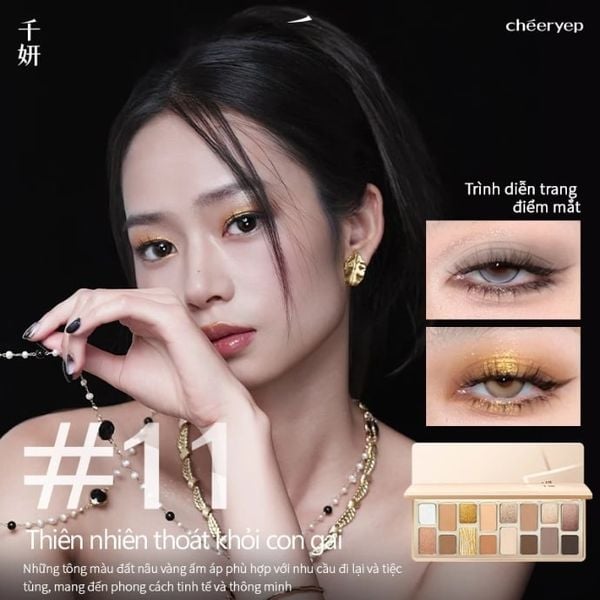 Đây là bảng mắt với gam màu ấm nhẹ nhàng, thiên về tông đất, rất phù hợp với những cô nàng thích vẻ ngoài tự nhiên nhưng vẫn muốn có chút lấp lánh nhẹ nhàng khi cần.