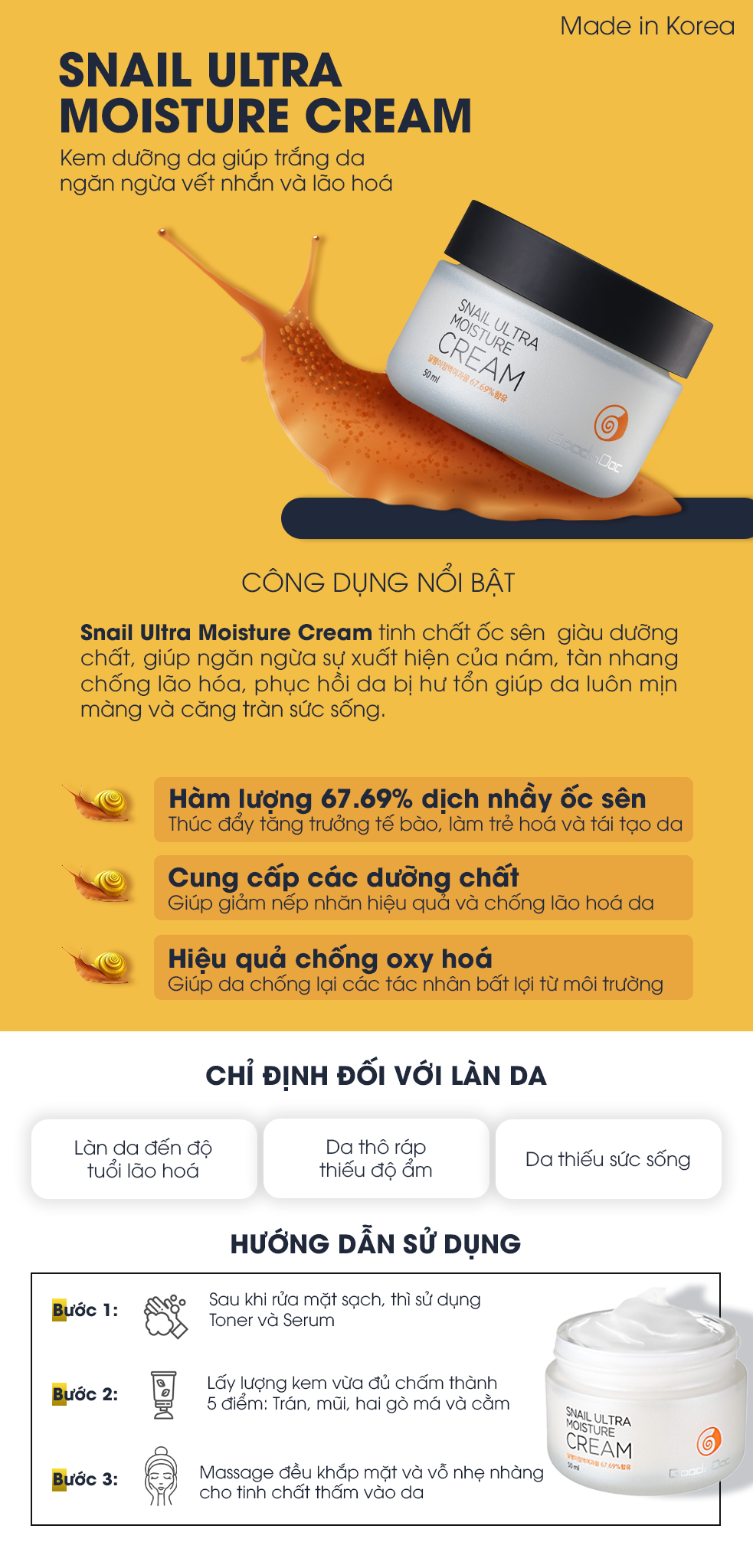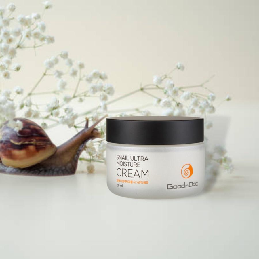 Sảm phẩm có thành phần chính từ dịch nhầy của ốc sên chiếm 67,69%. Một loại dưỡng chất chứa nhiều Hyaluronic acid được kiểm định là rất tốt cho làn da, khiến cho nàn da có thể hồi phục do sẹo xóa sạch các vết thâm do mụn và các nết nhăn, hồi phục làn da nhanh tróng. Goodndoc Snail Ultra Moisture Cream tinh chất ốc sên giàu dưỡng chất. . Phục hồi da bị hư tổn giúp da luôn mịn màng và căng tràn sức sống.