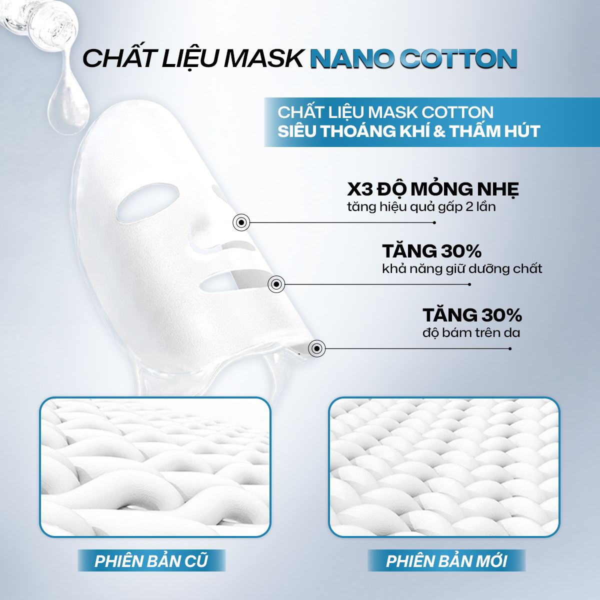 Mặt nạ được làm từ 100% từ cotton giúp hạn chế kích ứng, chất liệu khá mềm mại ôm sát mặt, thẩm thấu dưỡng chất tốt. Phần dung dịch bên trong đặc sánh như thạch, giúp dễ dàng massage mỗi lần sử dụng.