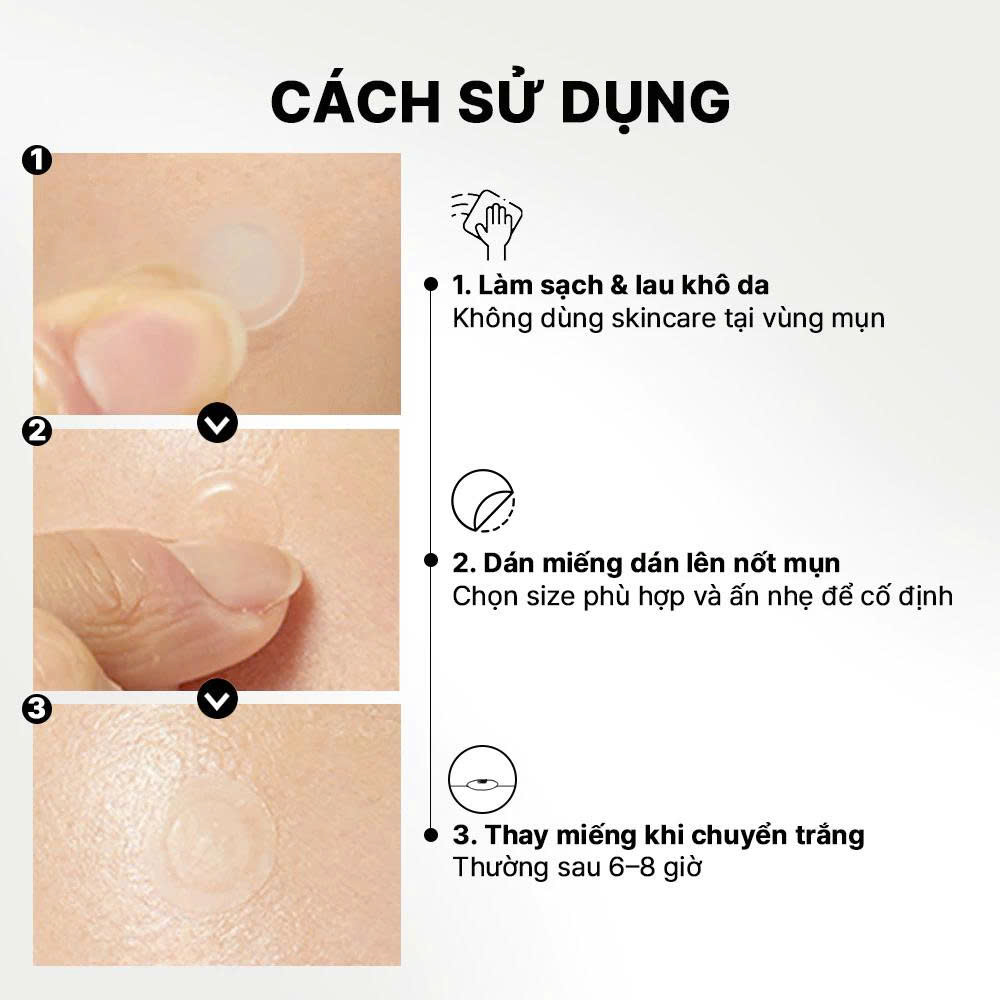 – Miếng dán mụn hydrocolloid giúp bảo vệ nốt mụn và hỗ trợ thấm hút dịch tiết từ vùng da bị mụn.