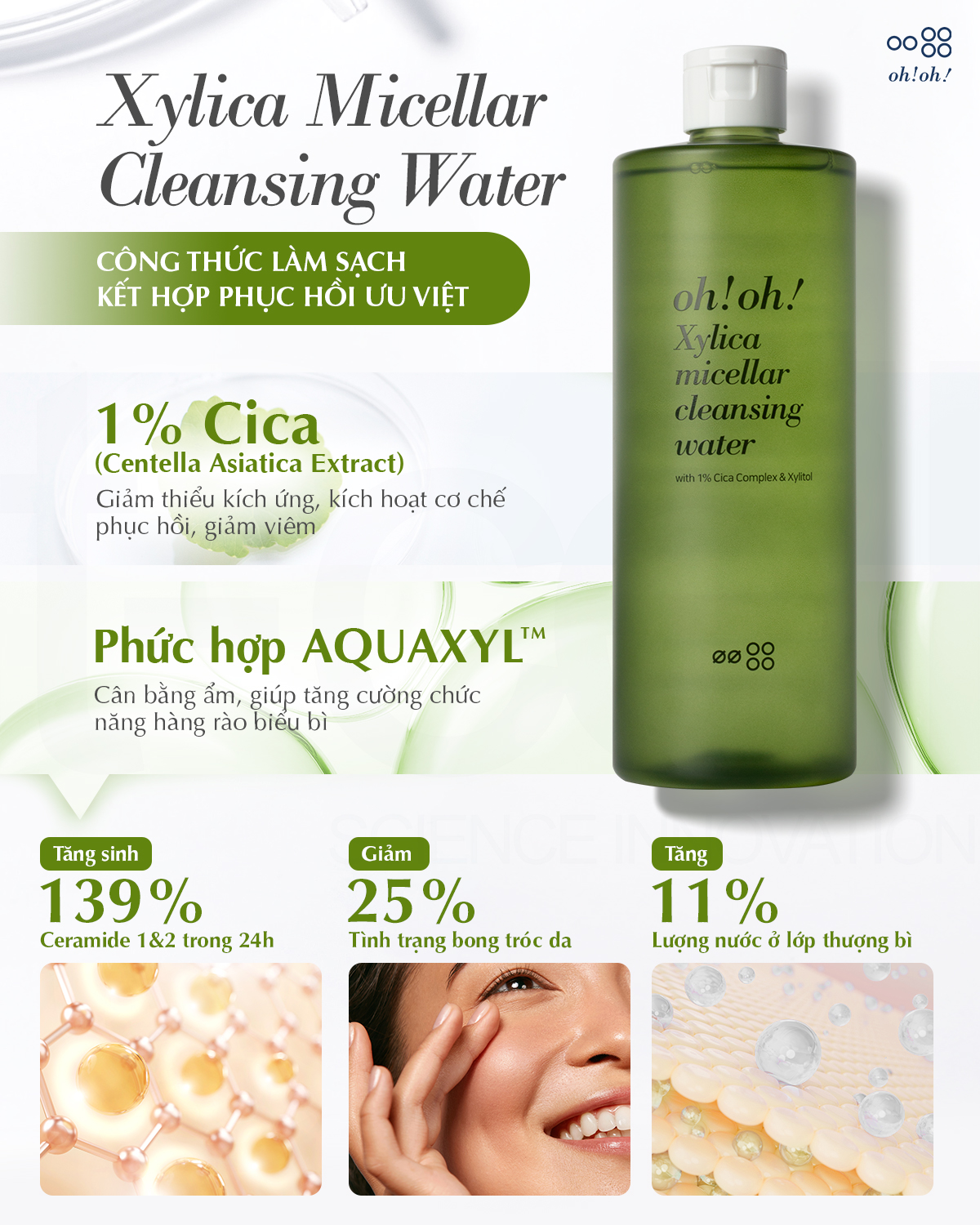 Nước Tẩy Trang Chuyên Sâu Phục Hồi Màng Lipid oh!oh! Xylica Micellar Cleansing Water  (with 1% Cica Complex & Xylitol)