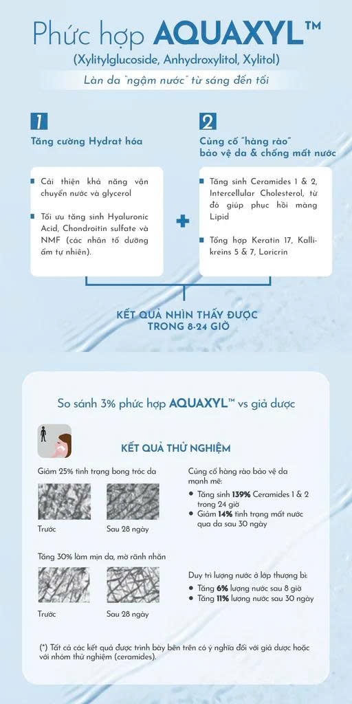 Các thí nghiệm In vitro và Ex vivo đã chứng minh rằng, Phức hợp AQUAXYL™ có công dụng mang lại làn da “ngậm nước” từ sáng đến tối: