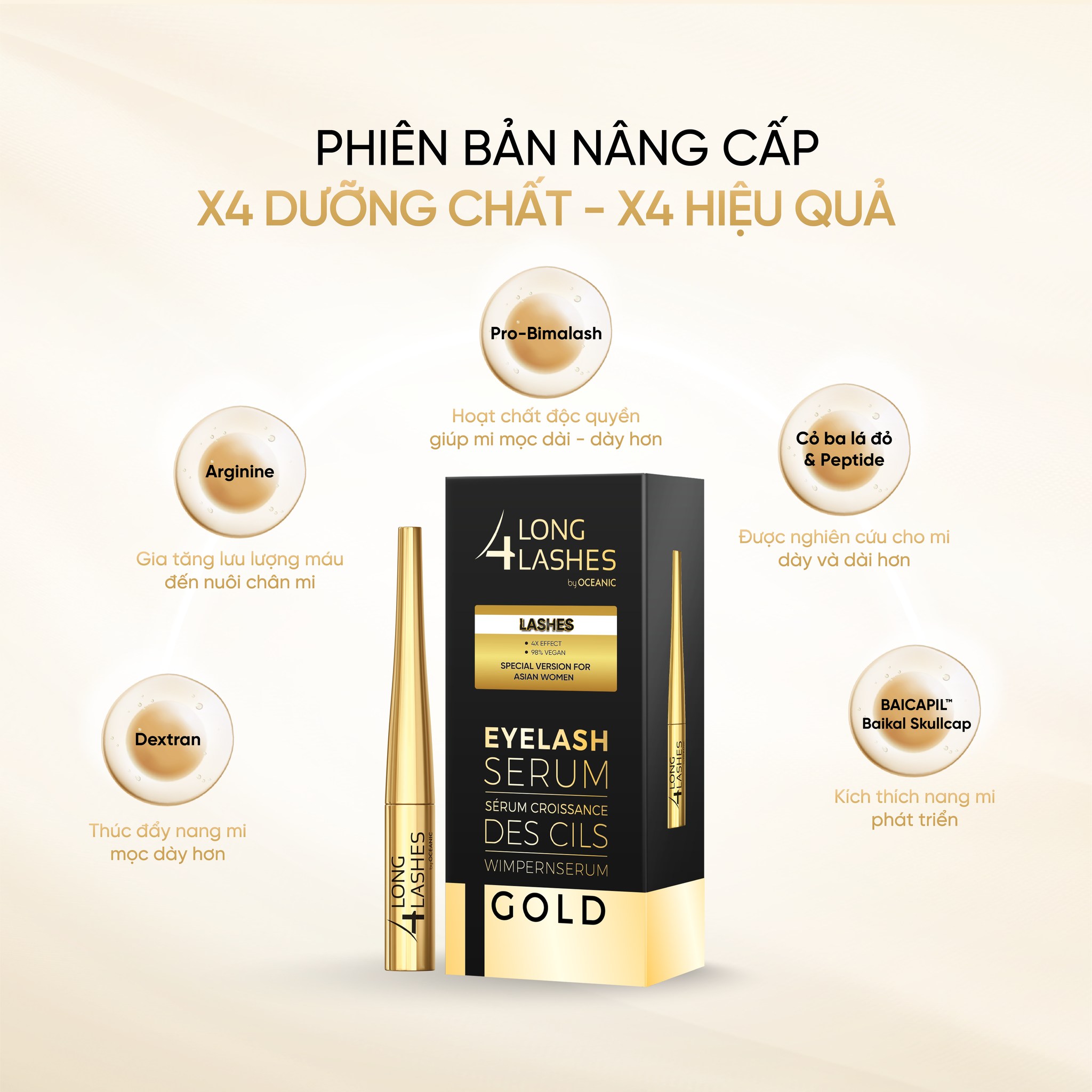 Serum dưỡng mi Long 4 Lashes Gold phiên bản nâng cấp được bổ sung nhiều dưỡng chất kích thích mọc mi nhanh dài, dày, đen và chắc khỏe, giảm gãy rụng sau 2 tuần