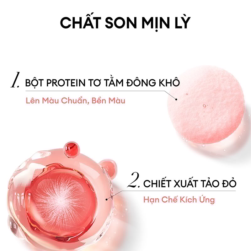 Chất son lì mềm mịn, mỏng nhẹ, lướt nhẹ trên môi, khi thoa lên môi tạo cảm giác mềm mại, ẩm mượt