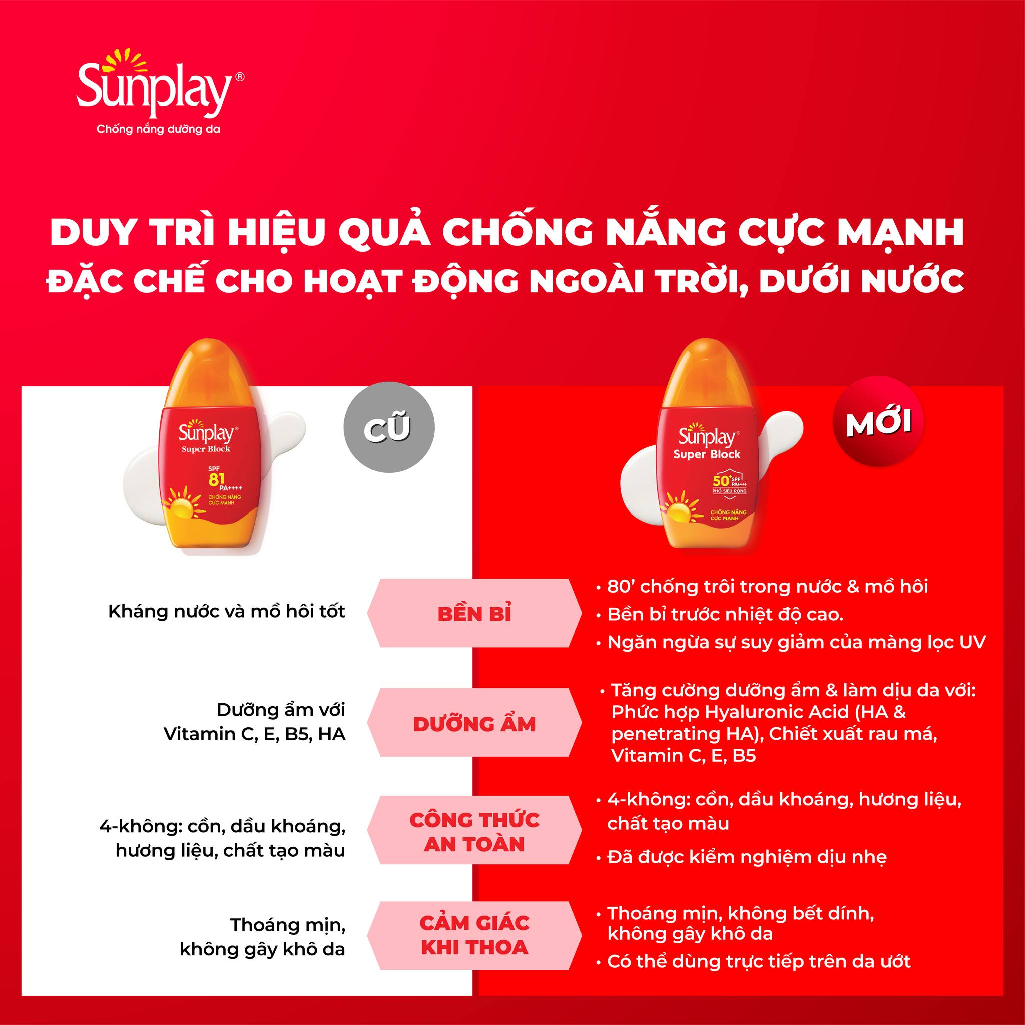 Ngoài chỉ số chống tia UV cao và duy trì khả năng chống nắng lâu dài trên da, Sunplay Super Block còn chứa các thành phần dưỡng ẩm, cùng kết cấu dạng sữa thấm nhanh, thoáng mịn và không gây khô da. Để bạn có thể tự tin tận hưởng mùa hè rực nắng và nước biển mát lành, không lo đen sạm, bỏng rát.