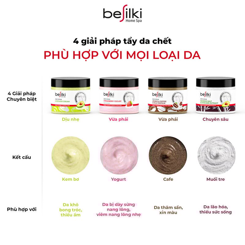 2. Besilki Home Spa Body Scrub #Bamboo Salt & Avocado Extract: Chiết xuất muối tre và bơ giúp làm sáng, trẻ hóa da