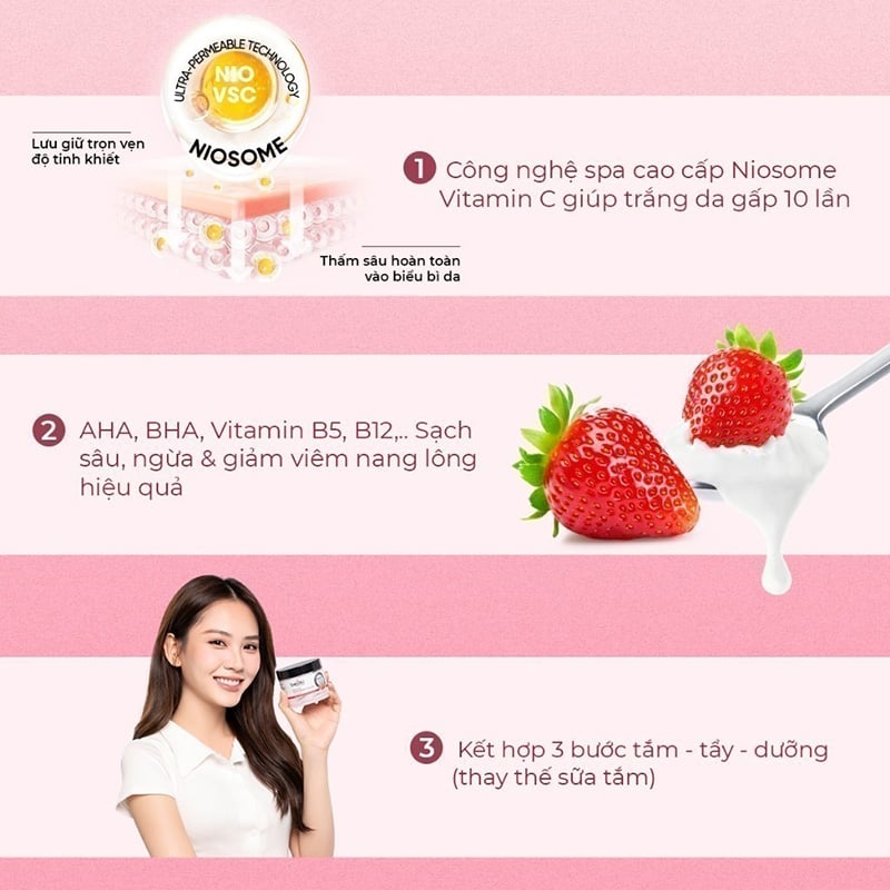 – Ngăn ngừa & hỗ trợ giảm viêm nang lông nhờ kết hợp 2 phương pháp peel da vật lý (từ vỏ hạt hạnh nhân) và peel da hoá học (AHA, BHA từ sữa chua & dâu tây)