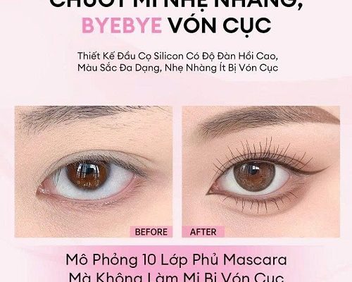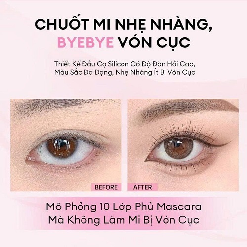 - Đầu cọ silicone linh hoạt: Thiết kế đầu cọ silicone có độ đàn hồi cao, chuốt mi nhẹ nhàng, không gây vón cục